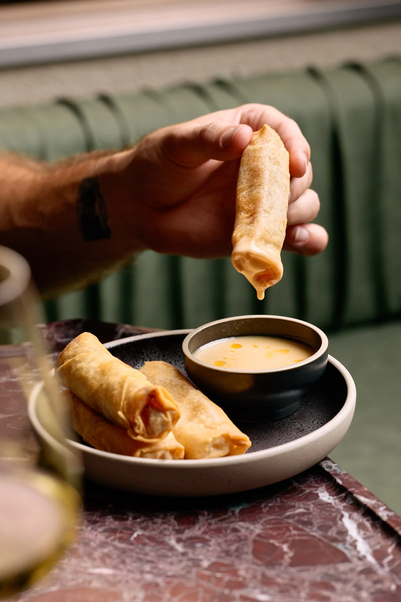 Chilli bean dressing, smoked duck egg yolk, lotus root crisps